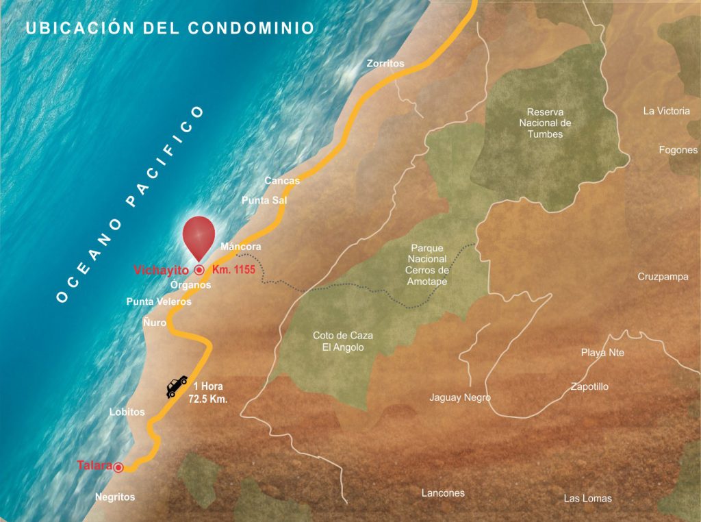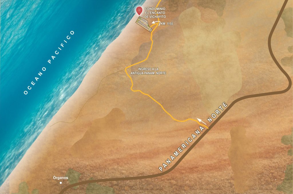 El condominio El Encanto de Vichayito está ubicado en el balneario de Vichayito, una de las playas más lindas del Norte del Perú, en el Distrito de Los Órganos, Piura y a solo 10 kilómetros de Máncora.