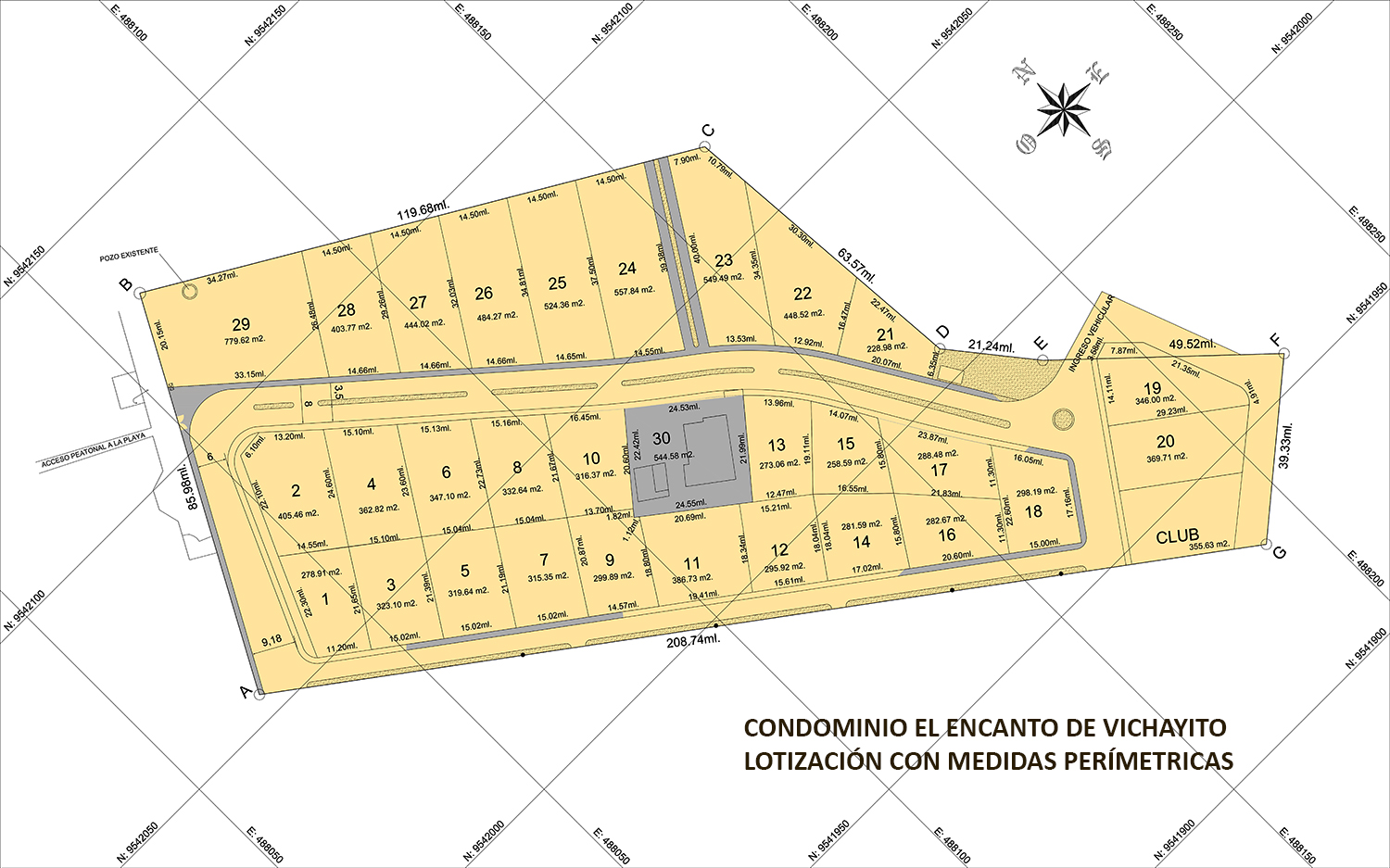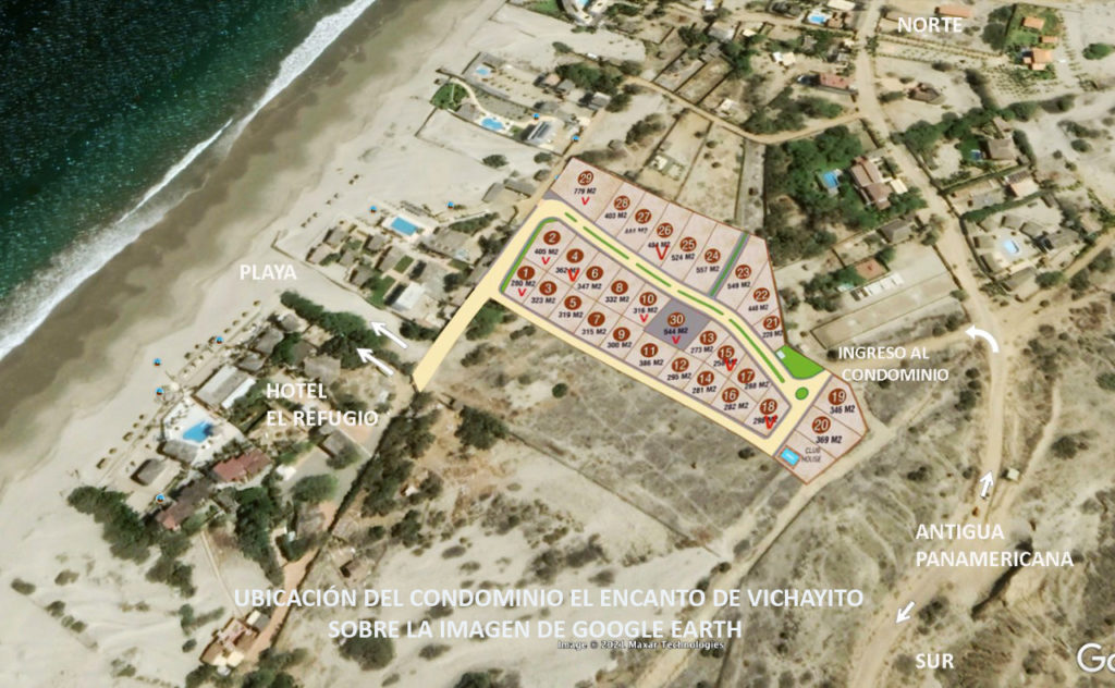 La primera imagen muestra la distribución de los lotes, el ingreso, los caminos, las áreas verdes y el área social. La segunda imagen muestra el condominio en la ubicación geográfica de Google Earth y donde se puede apreciar claramente la ubicación y dimensiones de cada lote, lo que hay alrededor del condominio y su cercanía a la playa.
