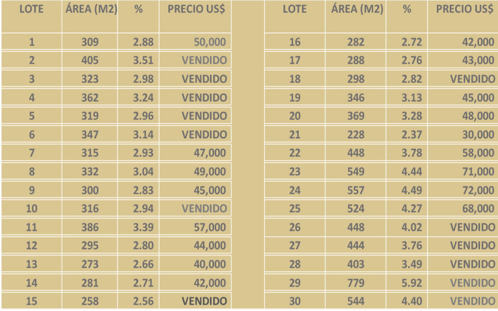 Los lotes vendidos se muestran en el Cuadro de Precios que se detalla en la sección “Inversión”.